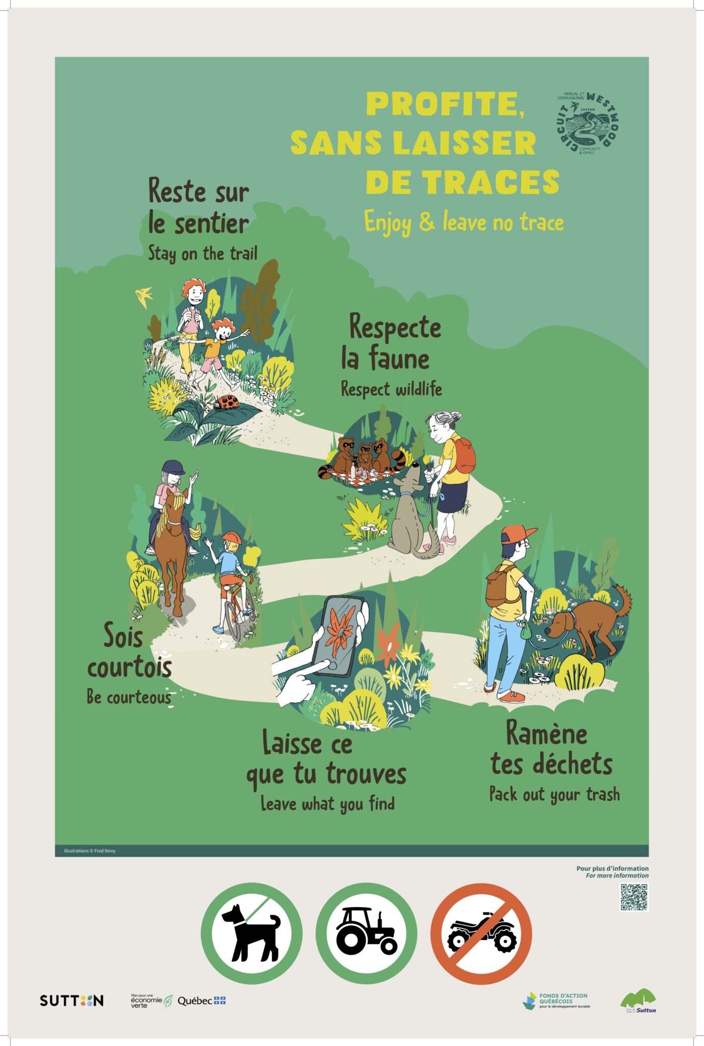 Usagers bienvenus : piétons, cyclistes, cavaliers, chiens en laisse